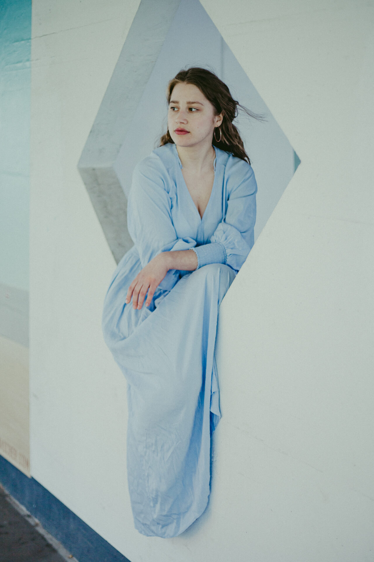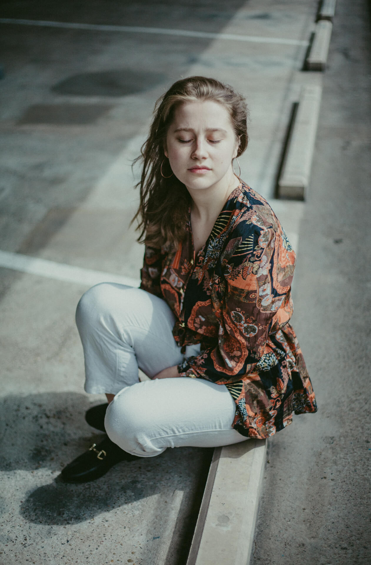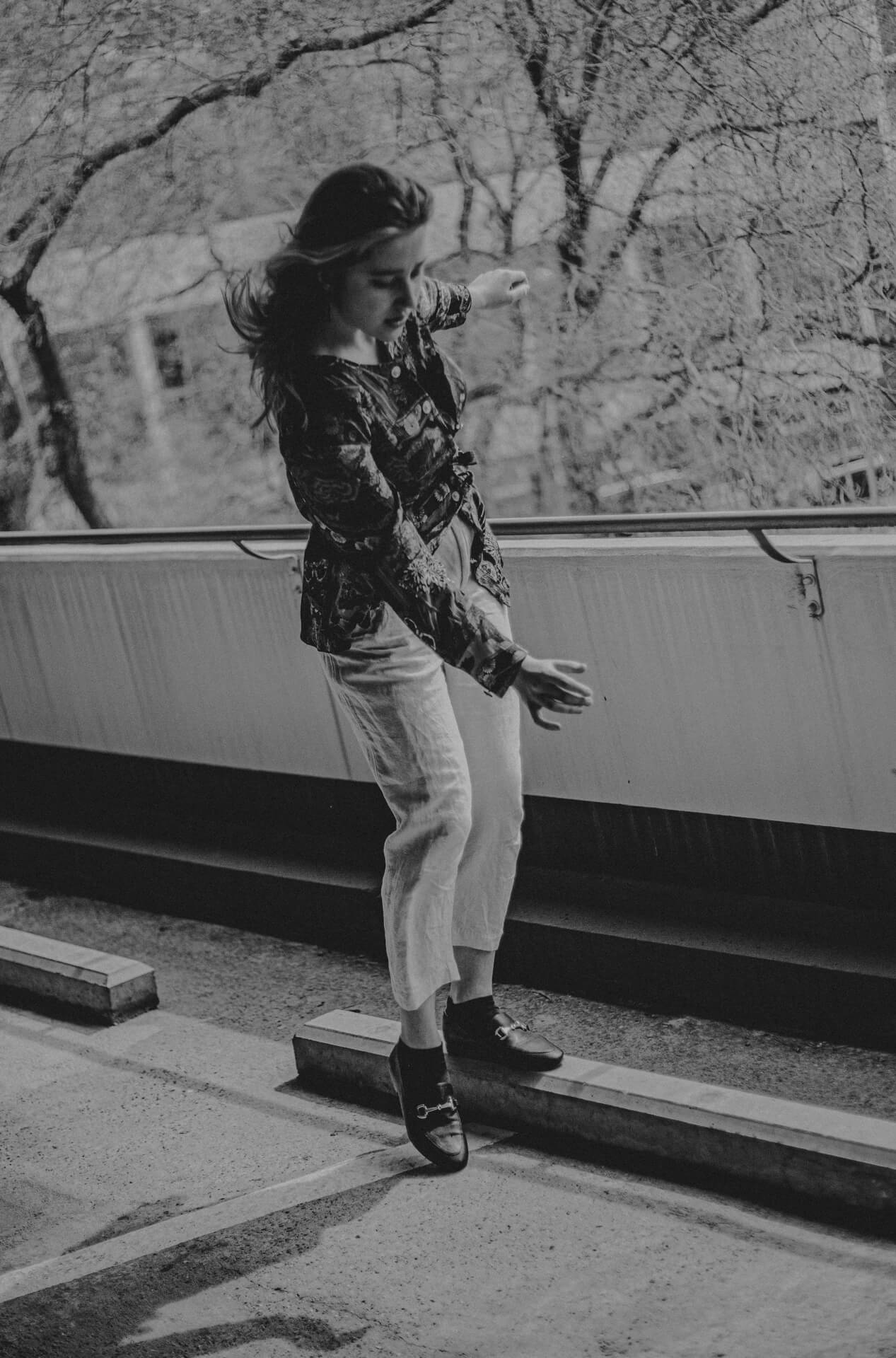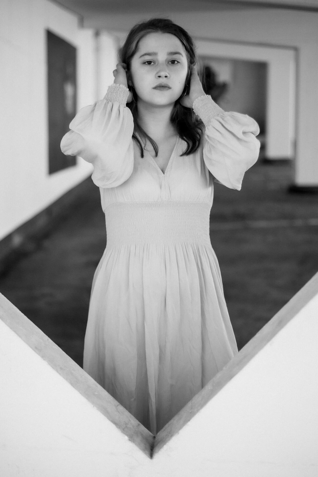 Ich bin in Stuttgart, um meine Schwester Theater spielen zu sehen. Bei dieser Gelegenheit biete ich Studierenden der HDMK Stuttgart Portraitshoots an. Marie ist da gerade in ihrem ersten Jahr des Schauspielstudiums. Wir treffen uns in einem Parkhaus, es ist ein warmer Tag und die Sonne steht hoch am Himmel. An den Wänden sind großformatige Fotografien tapeziert, die wir in das Shooting mit einbinden. Die Arbeit mit Marie ist leicht, alles geht wie von selbst. Sie nimmt meine Bildideen auf, fügt eigenes hinzu und entwickelt weiter. Ich bin gespannt, wo es sie noch hintreiben wird.
