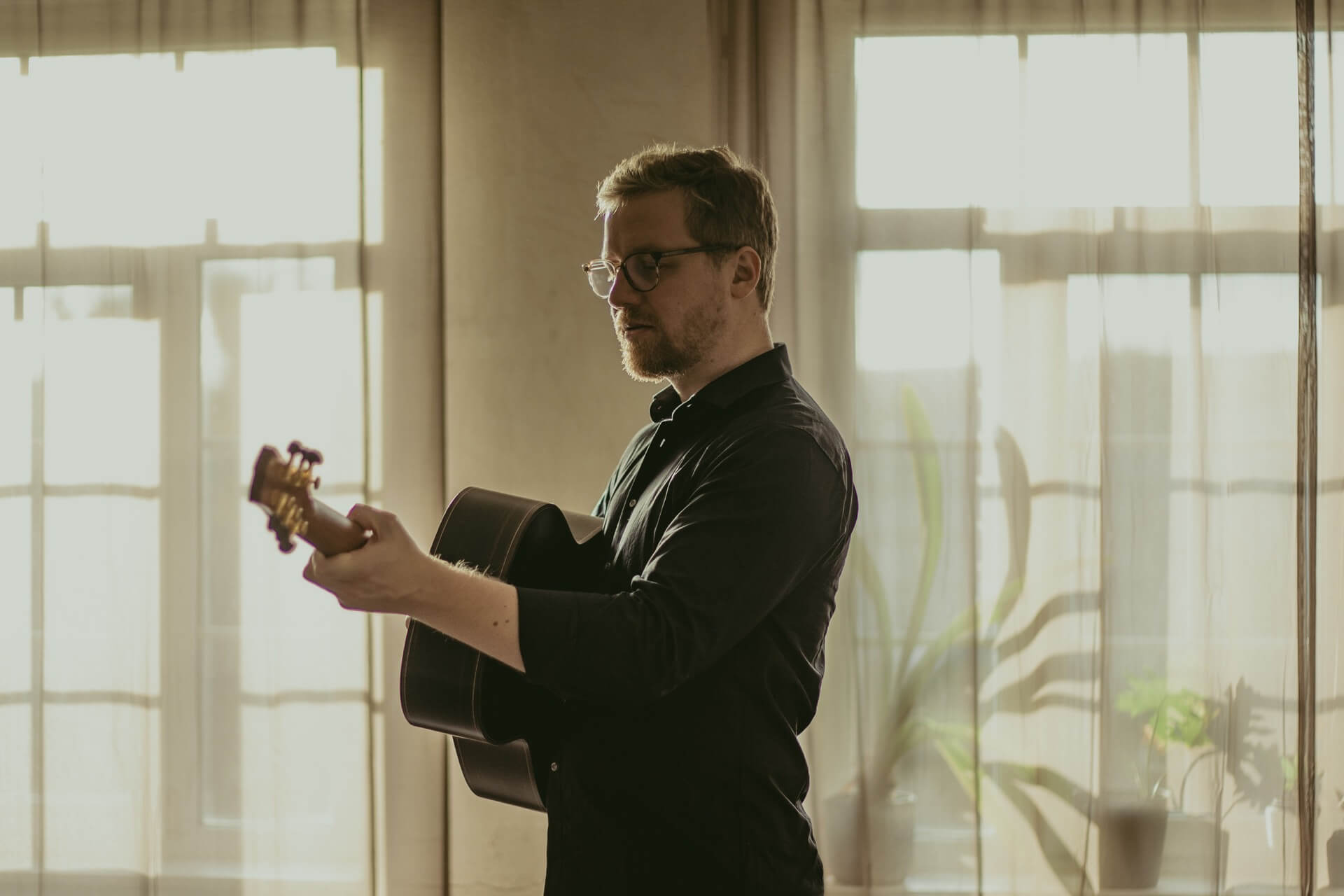 Philipp Wiechert ist ein Gitarrist, Komponist und Theatermusiker aus Leipzig. Ich durfte ihn schon in verschiedenen Duo-Projekten und auch Solo erleben. Außerdem teilt er sich mit Sönke Meinen die kreative Leitung für das Internationale Freepsumer Gitarrenfestival. Philipp liebt das Theater, auch das bindet er in seine musikalischen Tätigkeiten ein und schreibt so einiges an Theatermusiken. Er ist also eine Art Hans-Dampf in allen Gassen. Wir treffen uns zum Fotografieren in meinem Studio in der Alten Kaffeerösterei in Plauen. Philipp mag es nicht sonderlich, vor der Kamera zu stehen, aber schaut euch die entstandenen Bilder an! Ich liebe sie sehr, die Farbigkeit und die Stimmung sind einfach wundervoll.